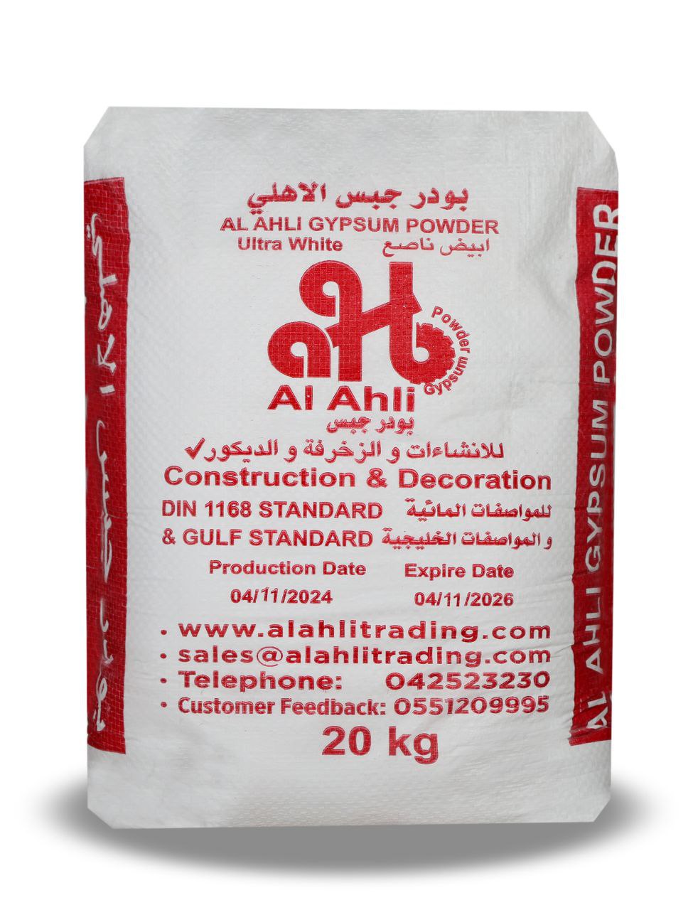 AlAhli gypsum powder in UAE is a super-fine white material. This powder is made by mining, crushing, heating and processing natural gypsum. When mixed with water, it makes a slurry which can be formed in different shape. Al Ahli gypsum renders a smooth and shiny finish and can be used for construction and decoration.
